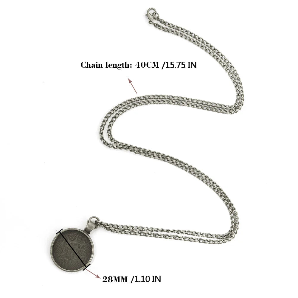 High-quality glass dome encasing detailed artwork, with a durable metal chain in a retro finish.