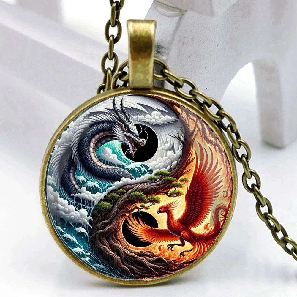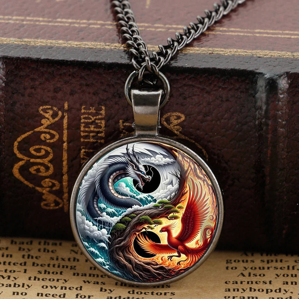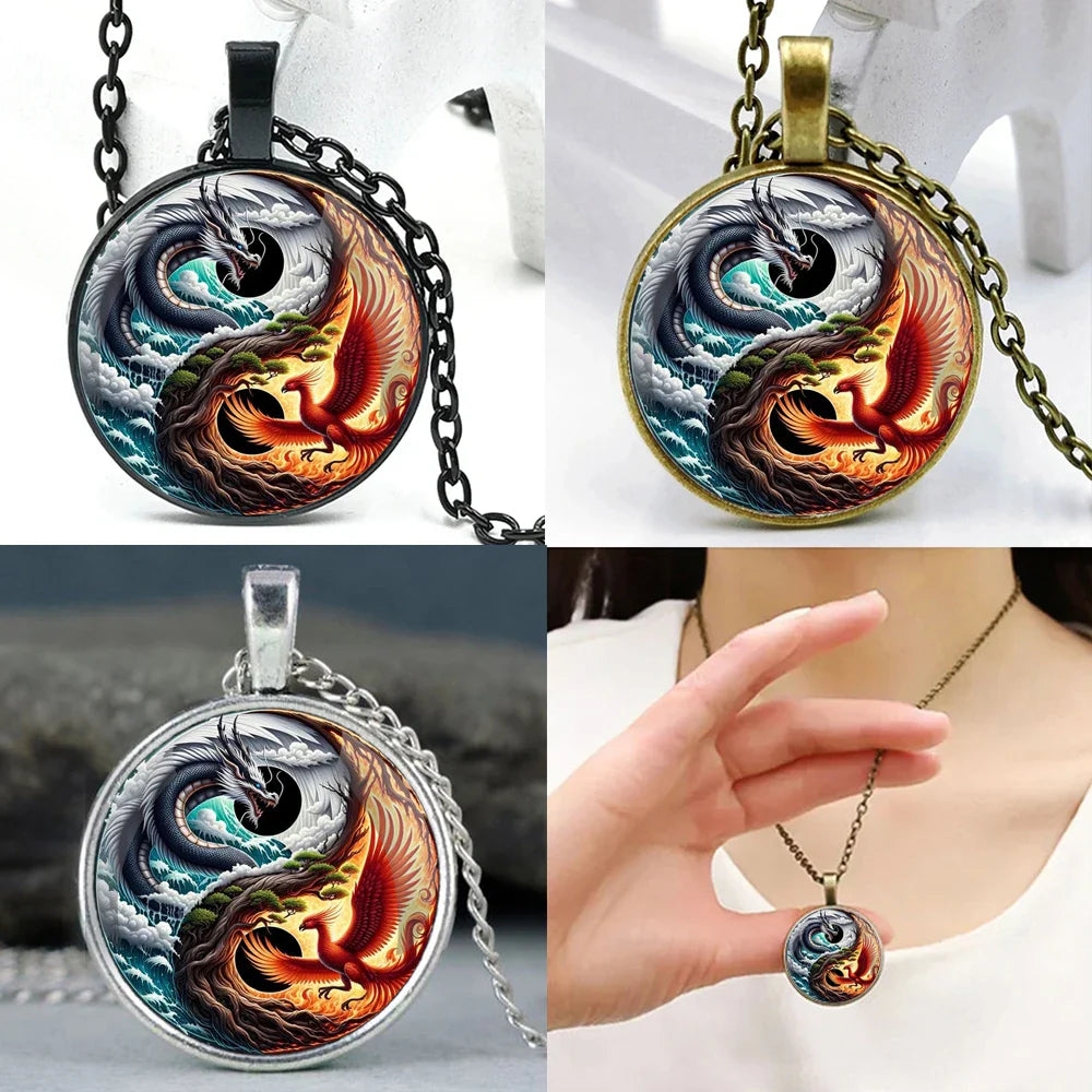 Retro Yang Phoenix and Yin Dragon Glass Dome Pendant Necklace – Handmade Chain Jewelry for Men & Women