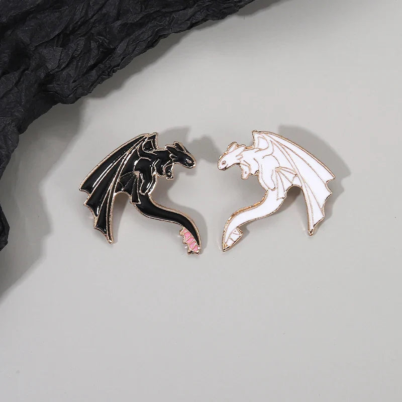 Black & White Pterosaur Enamel Pins – Cartoon Dragon Brooches for Kids & Friends