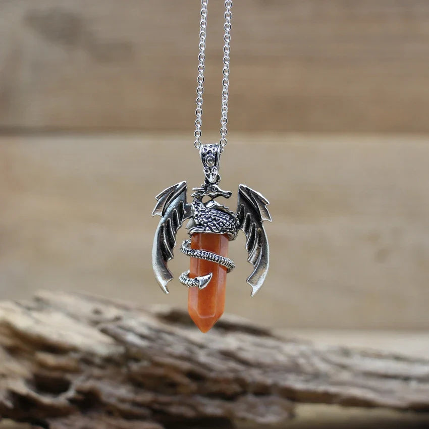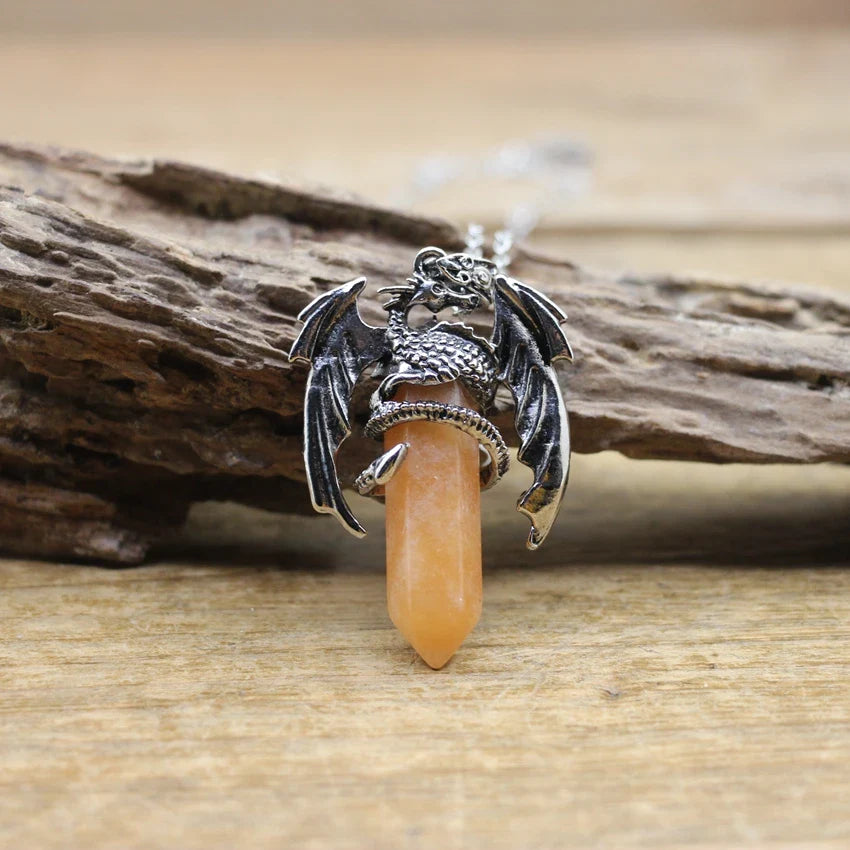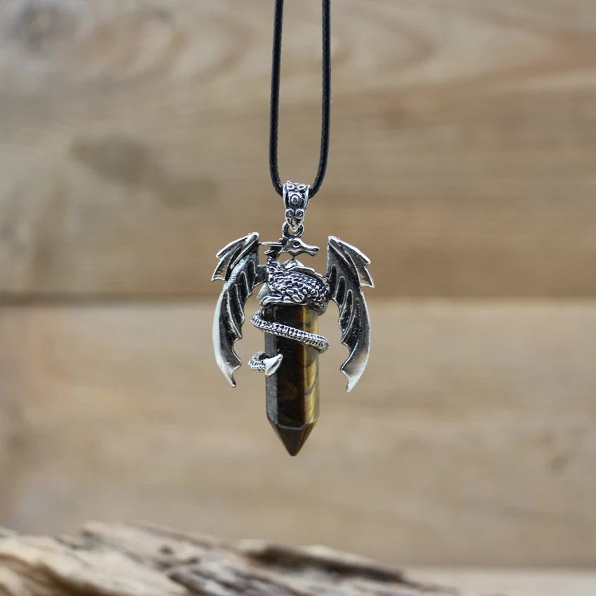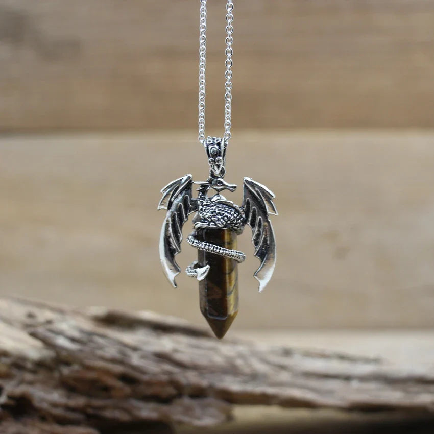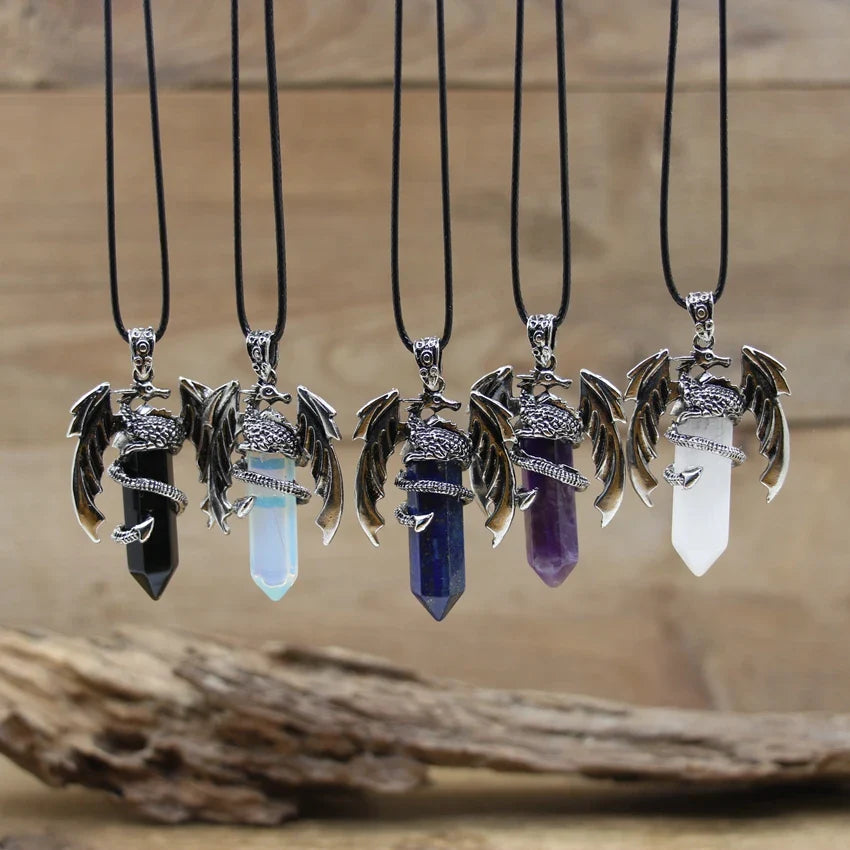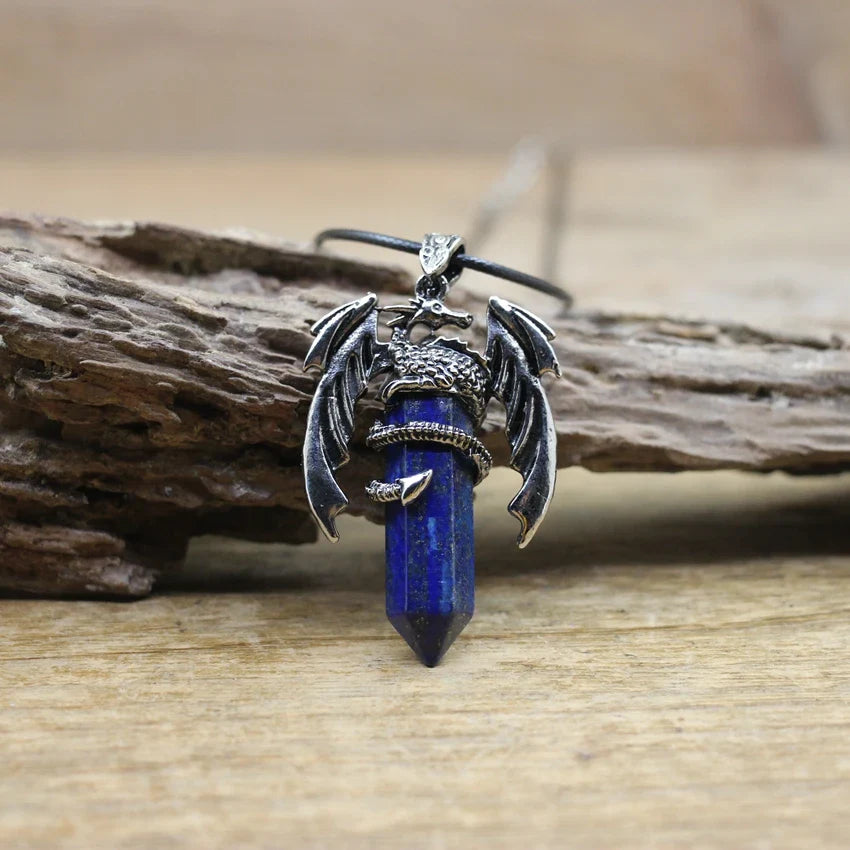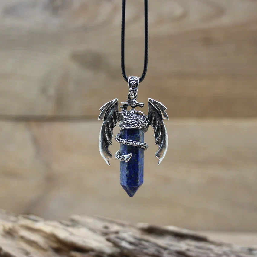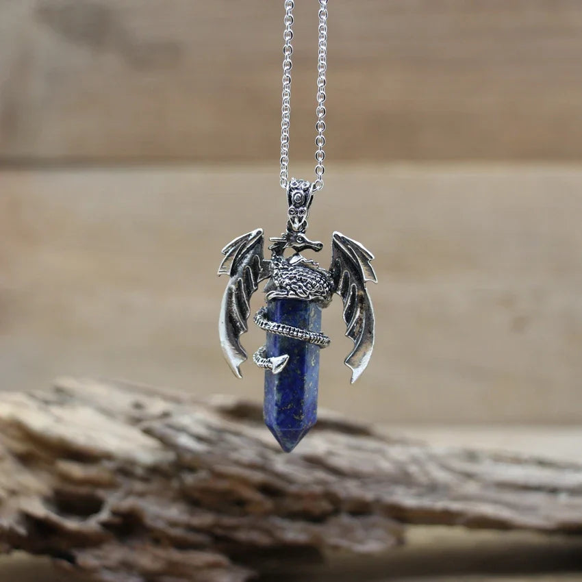 Natural gemstone (such as lapis, amethyst, or quartz) with metal alloy dragon detailing and a durable chain.
