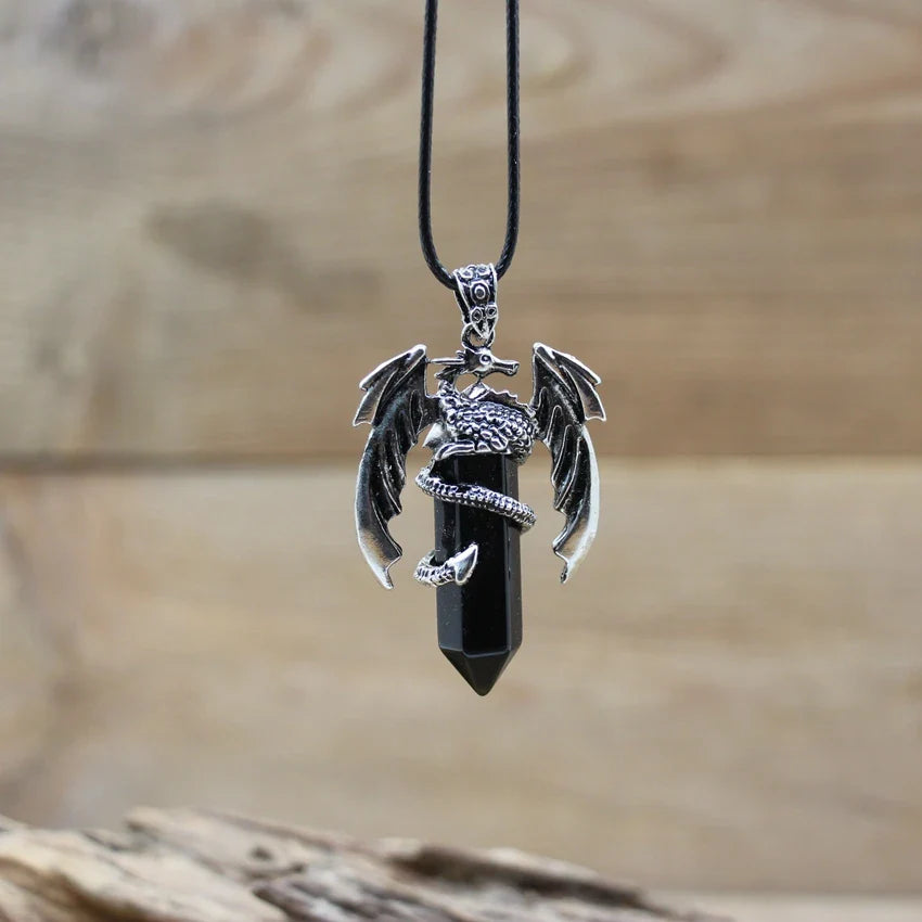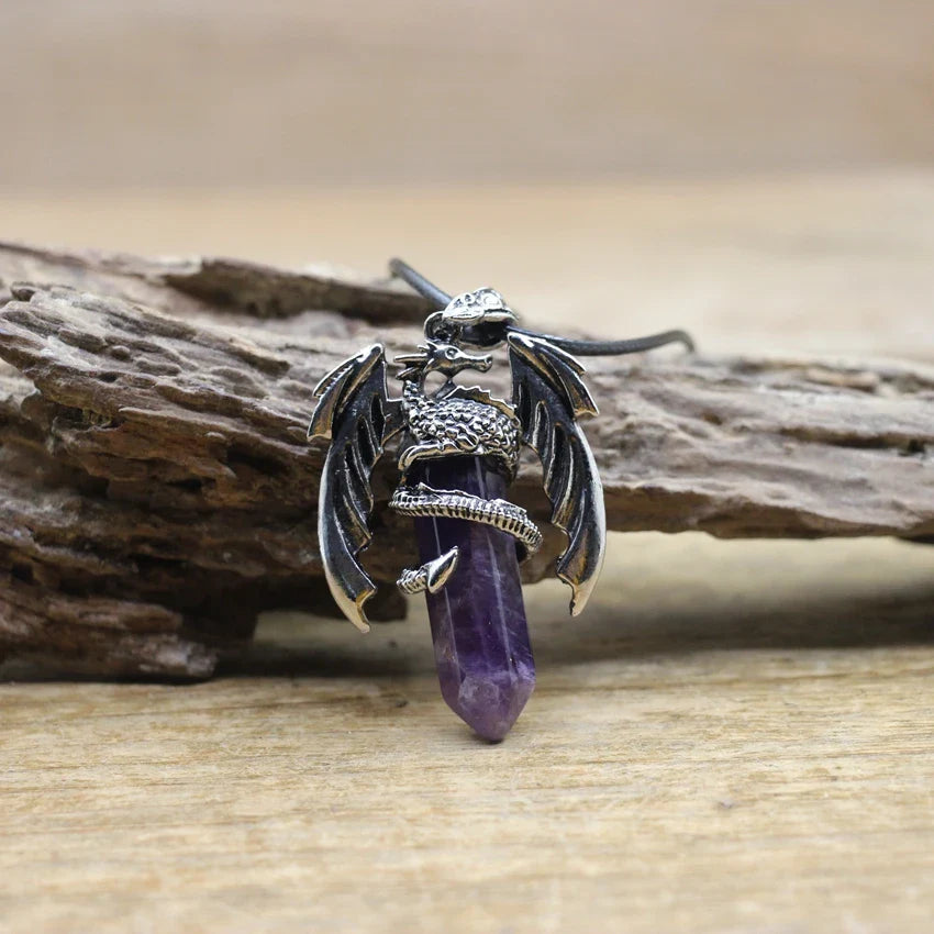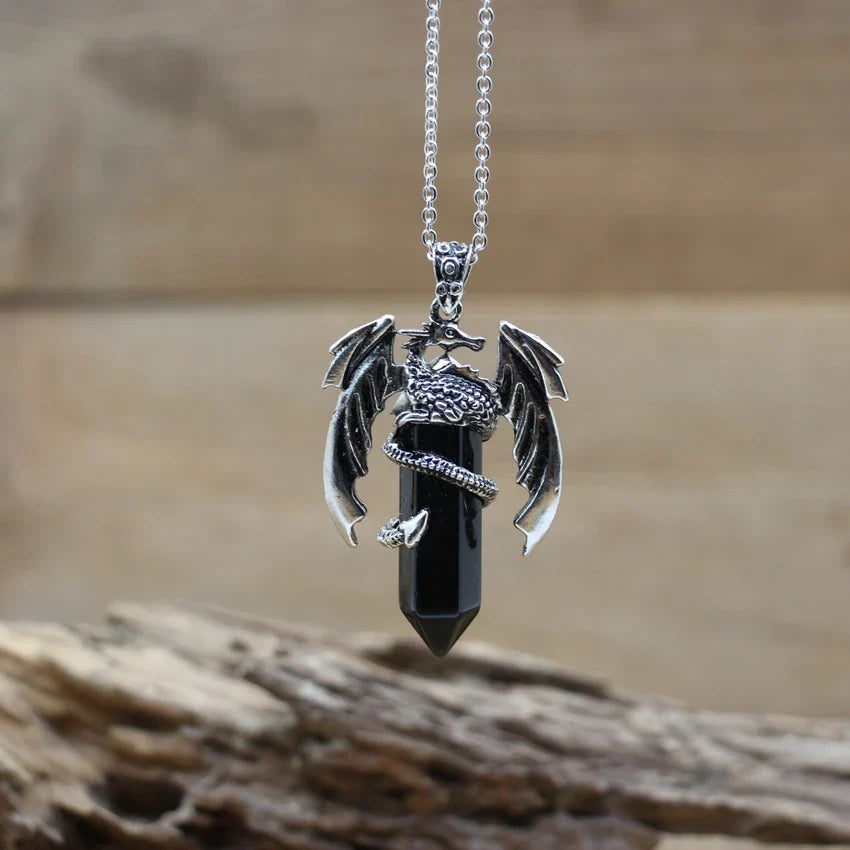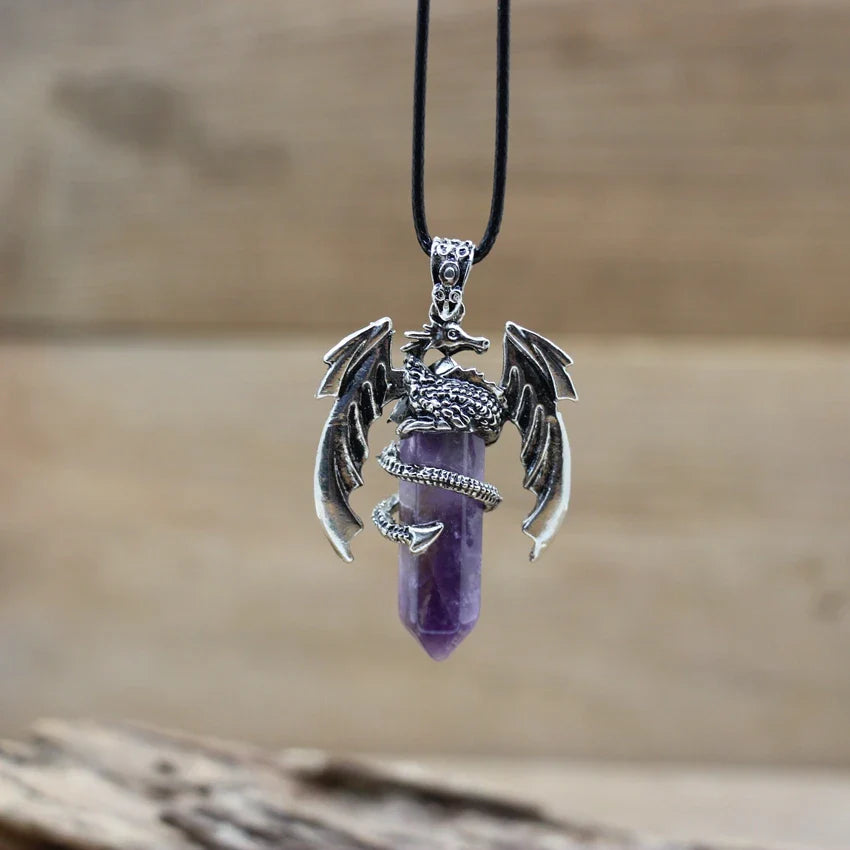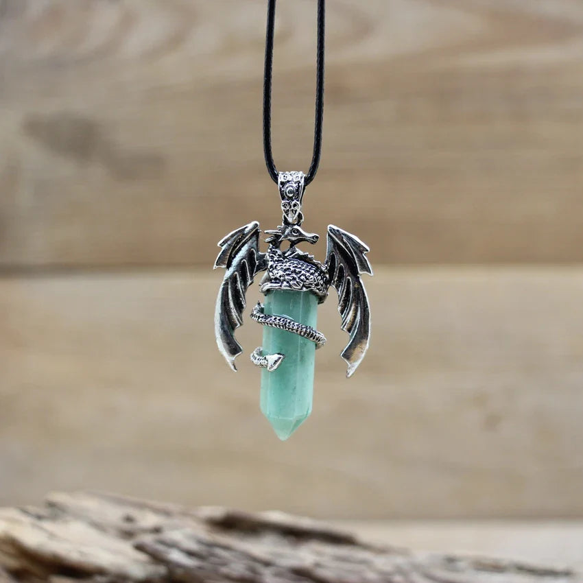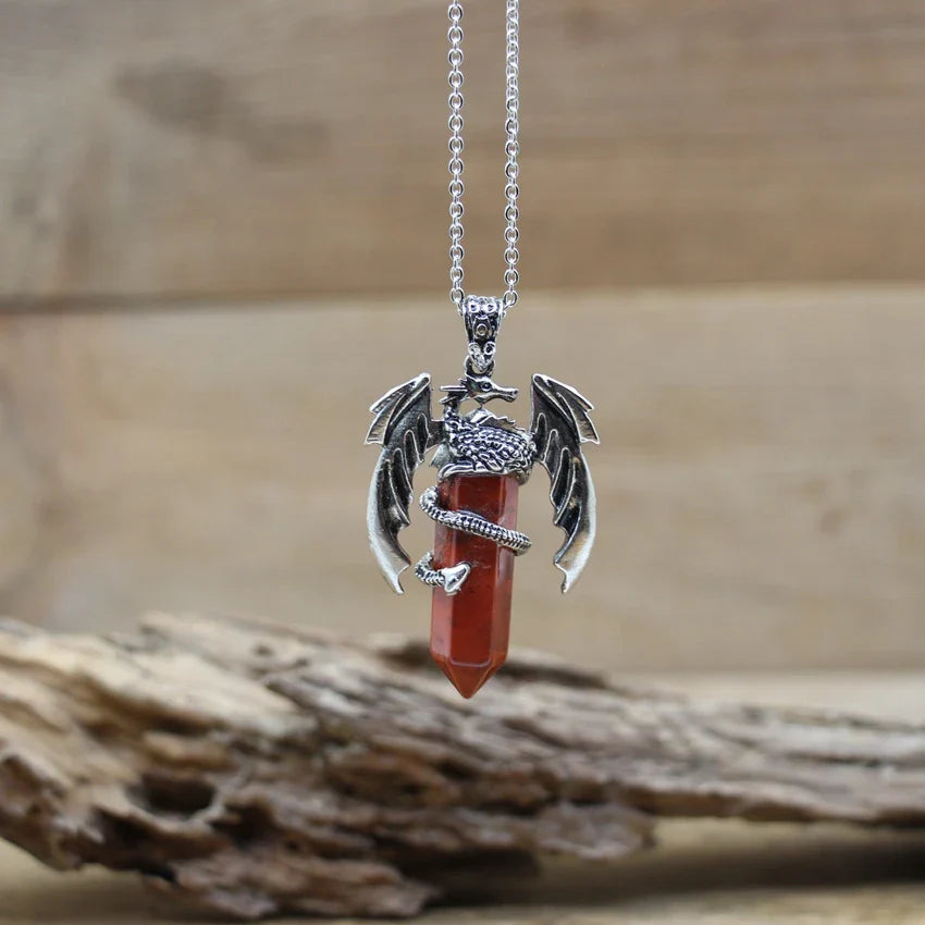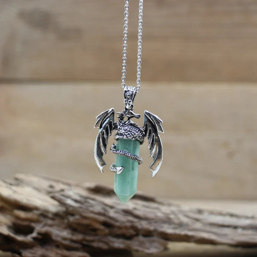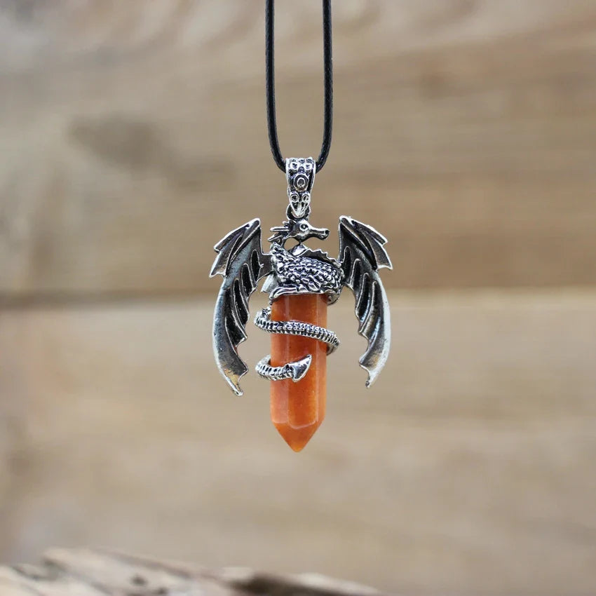 Natural gemstone (such as lapis, amethyst, or quartz) with metal alloy dragon detailing and a durable chain.
