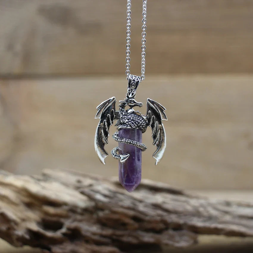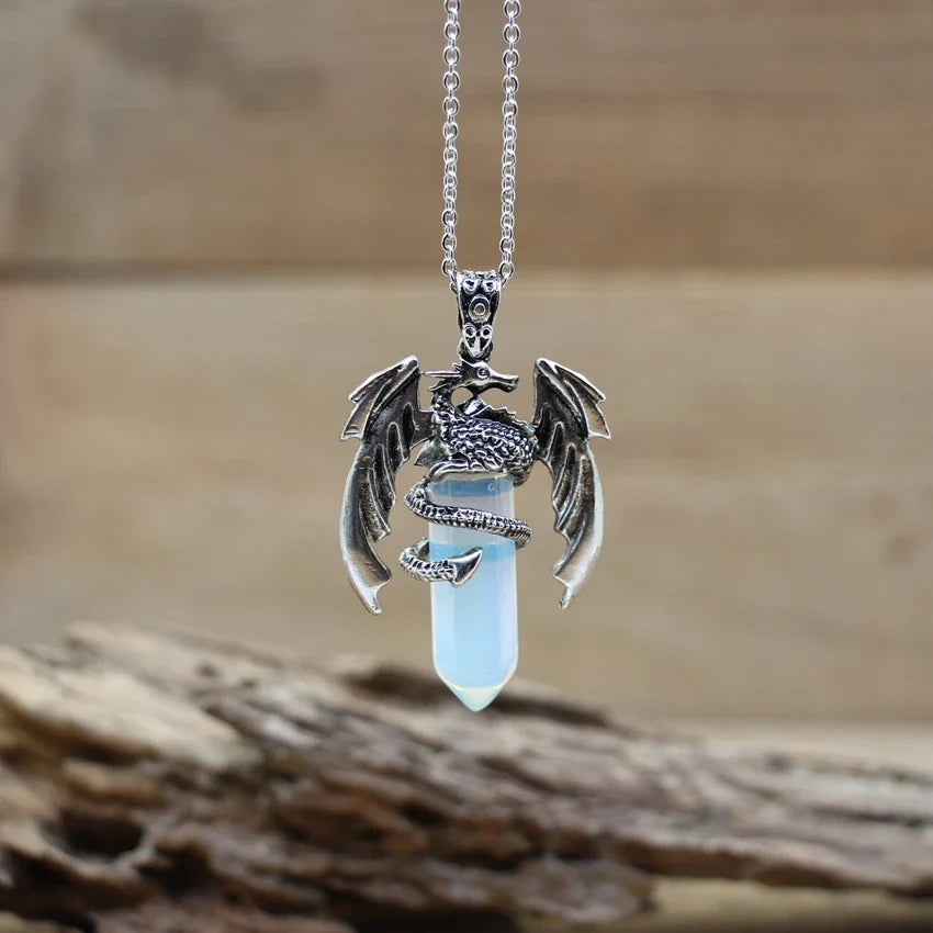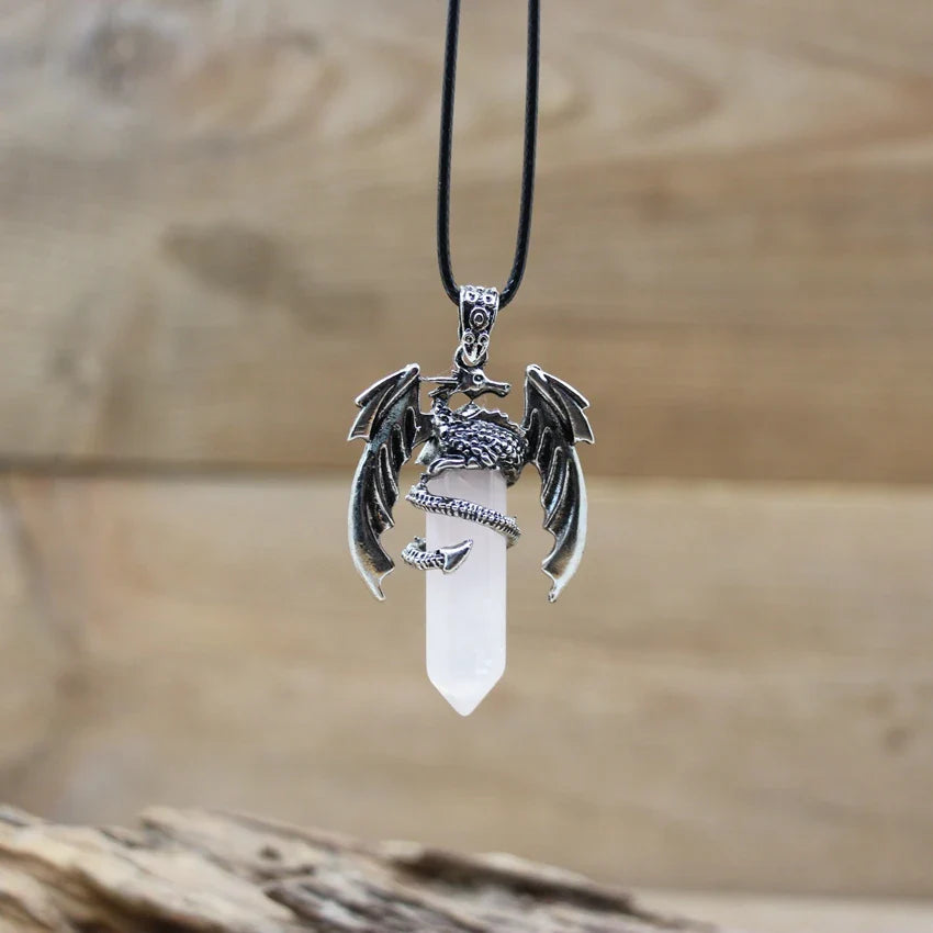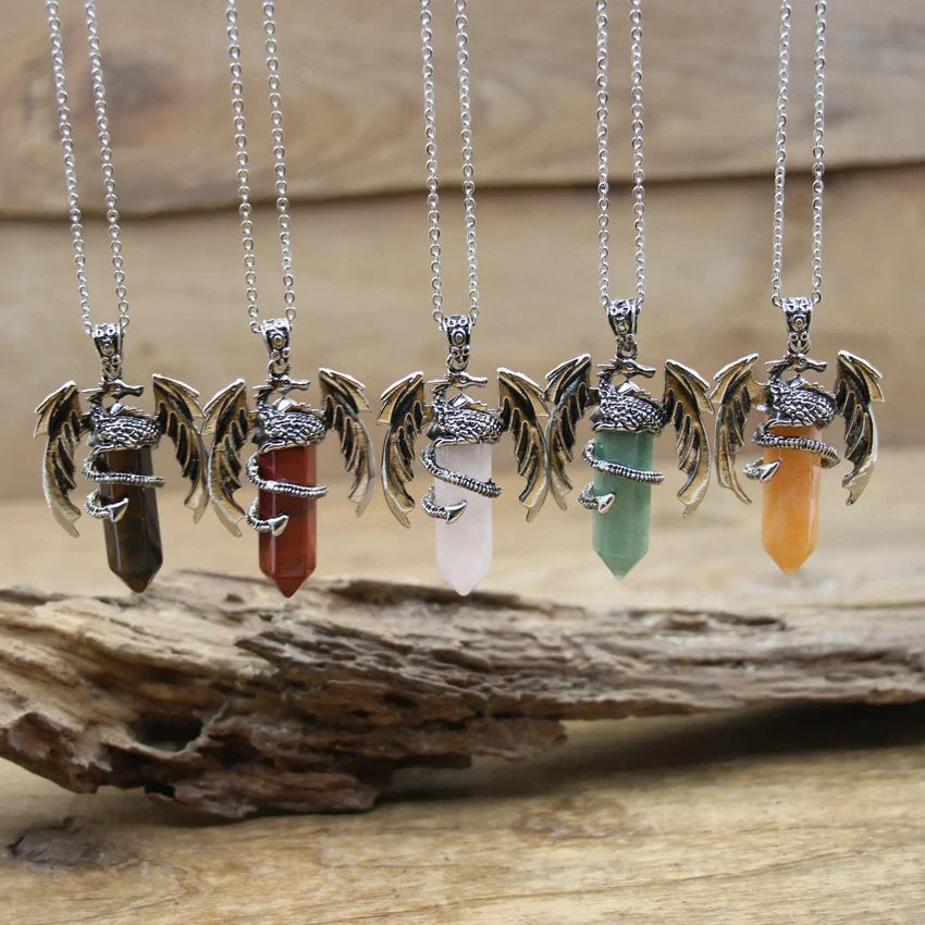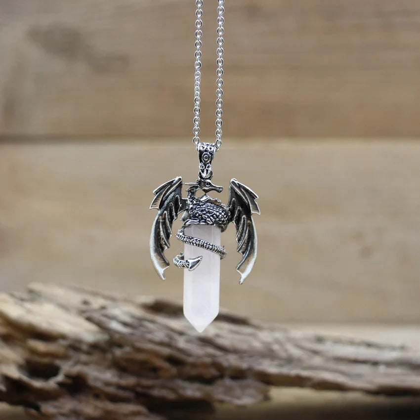 Harness the power of nature and myth with this Quartz Dragon Man Necklace — featuring a hexagonal gemstone pendant wrapped in a vintage dragon design, perfect for healing, style, and spiritual balance.