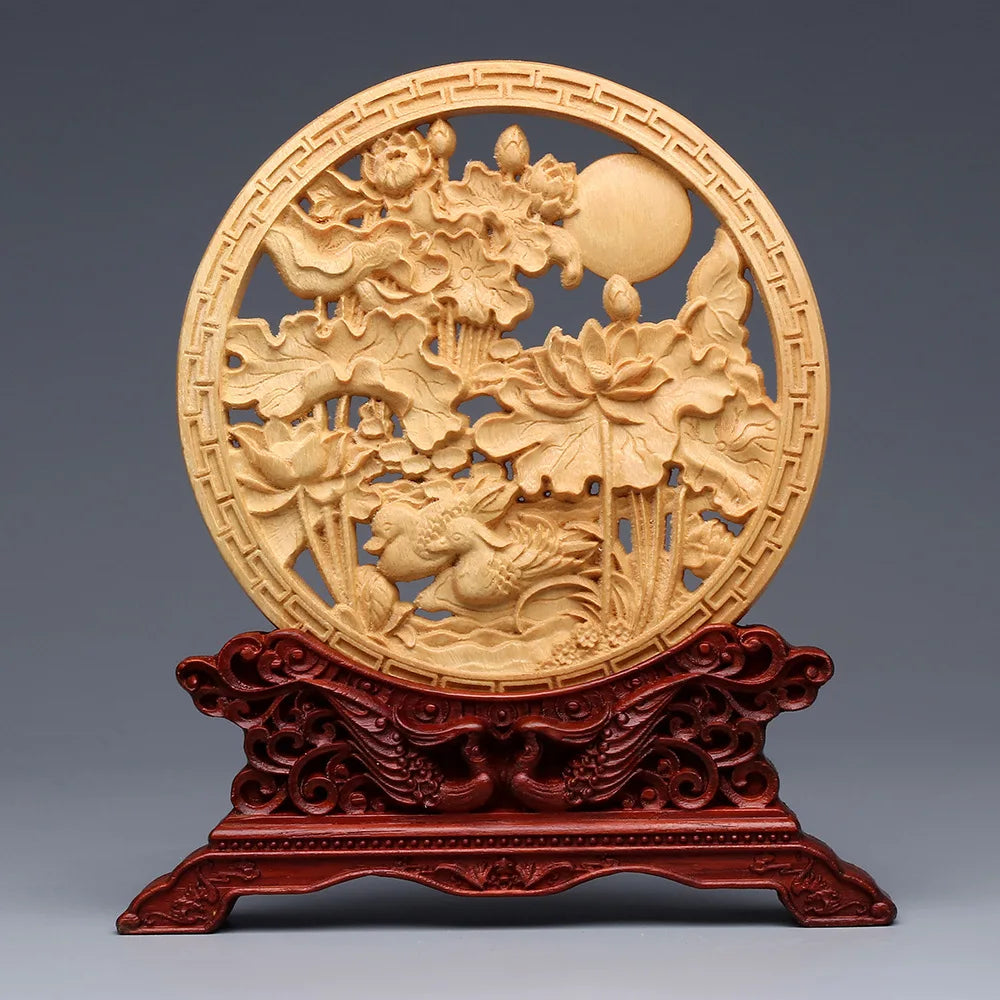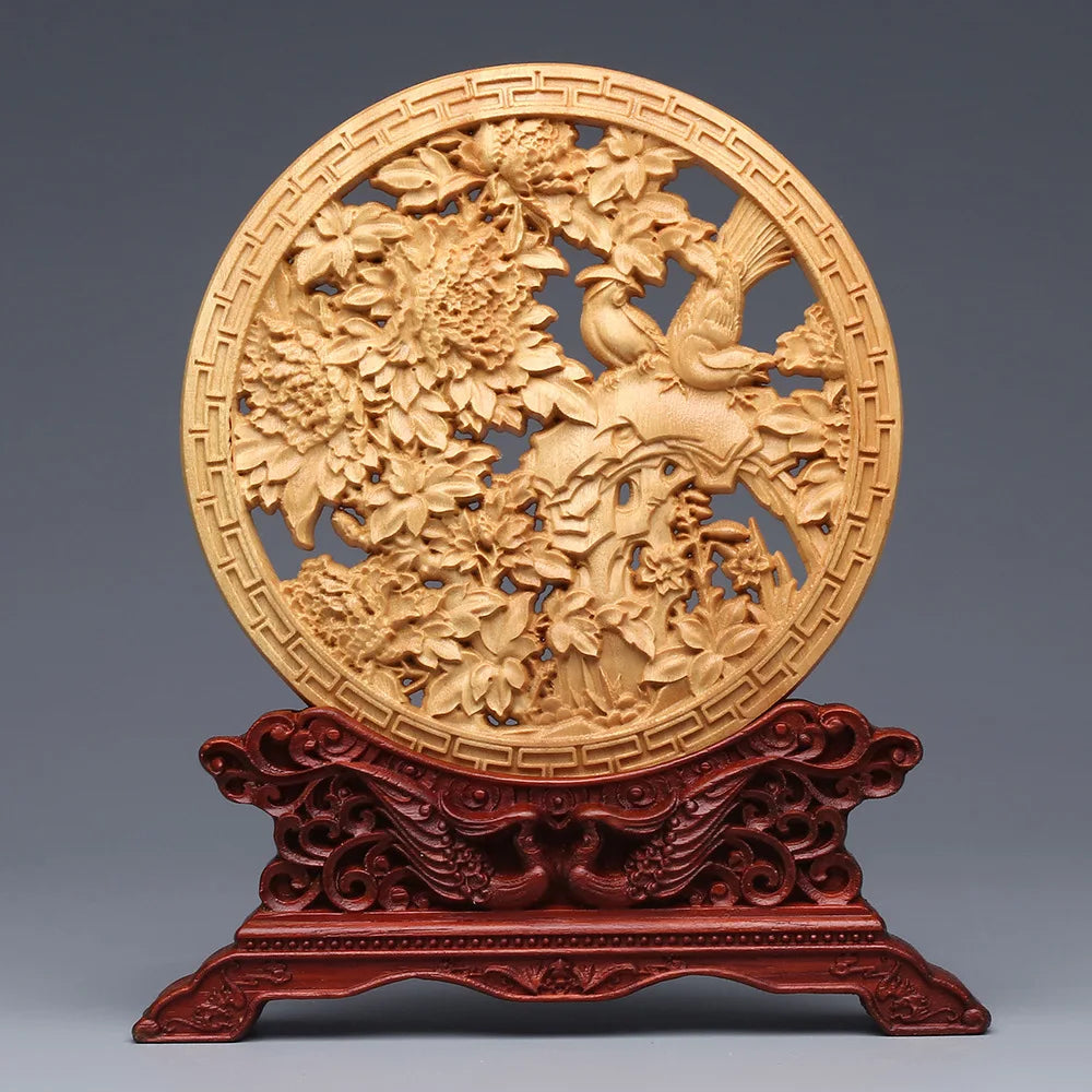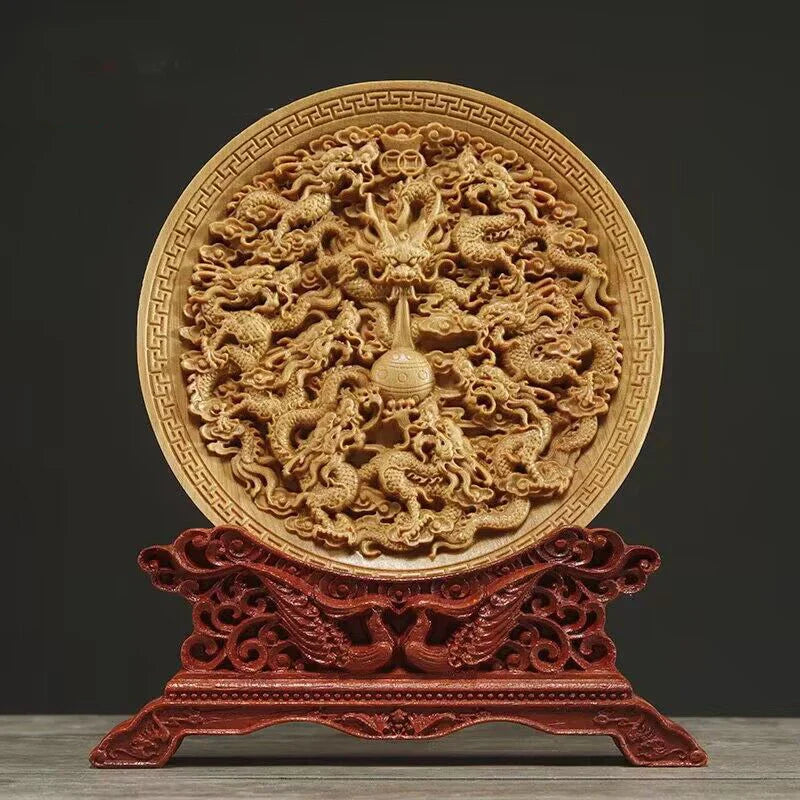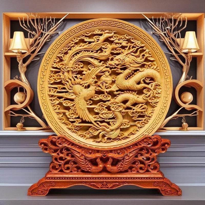 Wood Carving Dragon and Phoenix Round Art Statue – High-Quality Home & Office Decoration Mascot