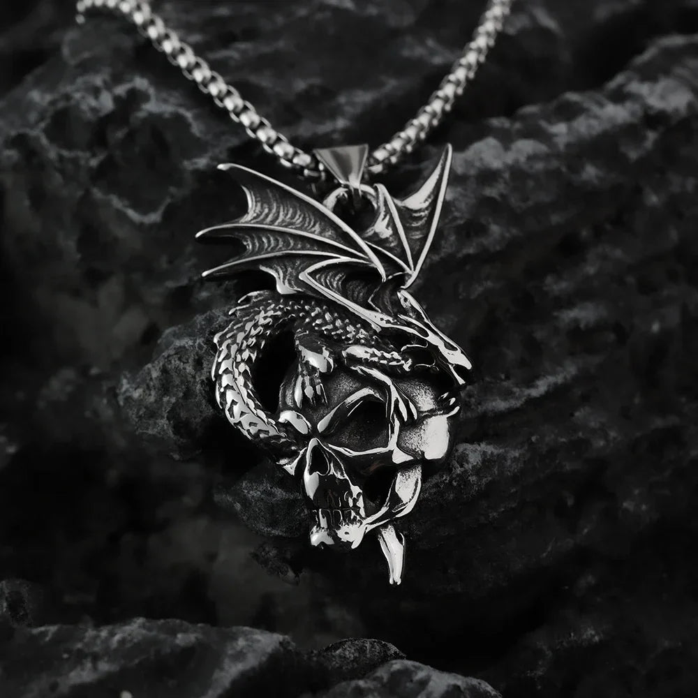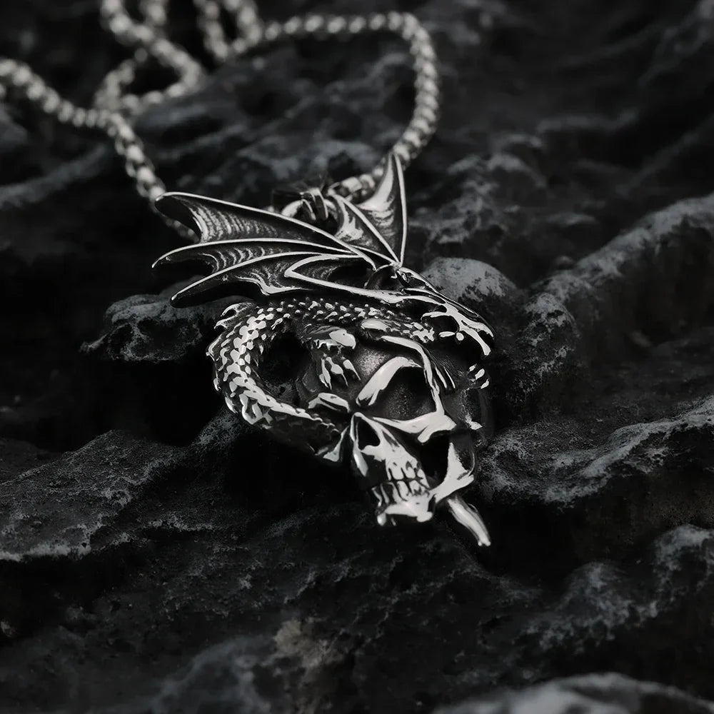 Premium zinc alloy with a distressed vintage finish, featuring a robust chain and flame dragon pendant.