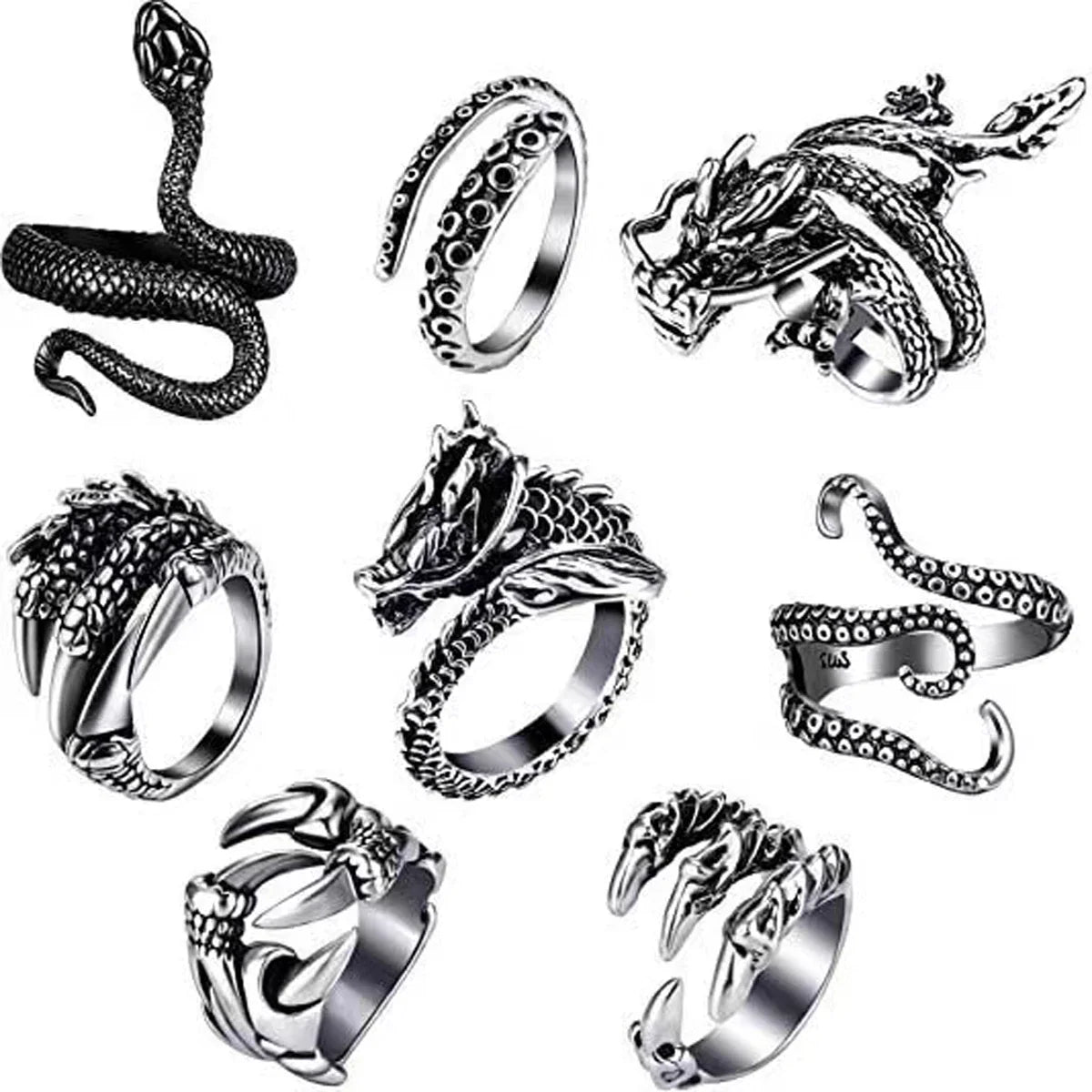 8 Pieces/Set Vintage Animal Open Rings – Dragon, Snake, Octopus & Eagle Claw Punk Accessories for Men