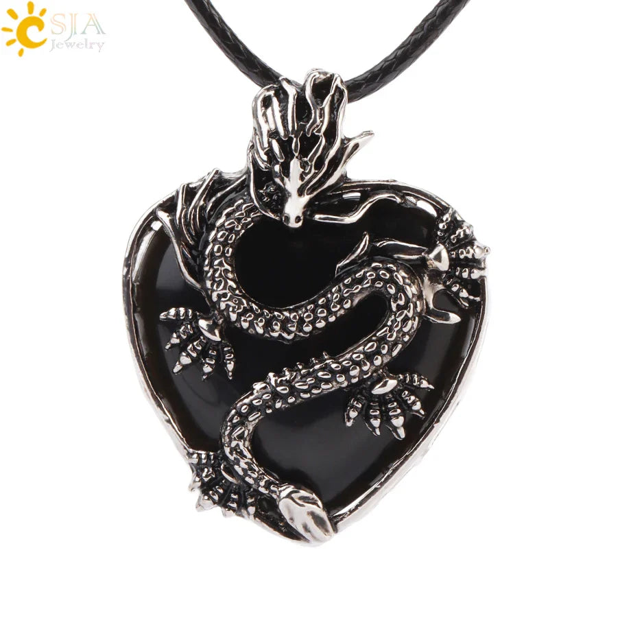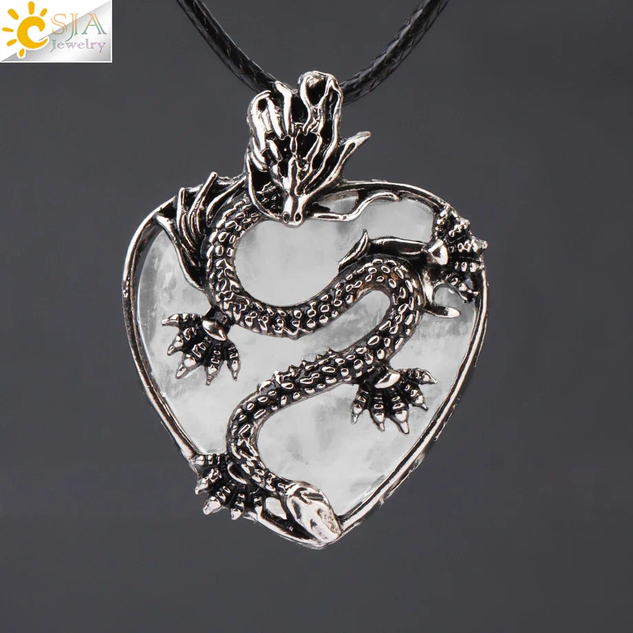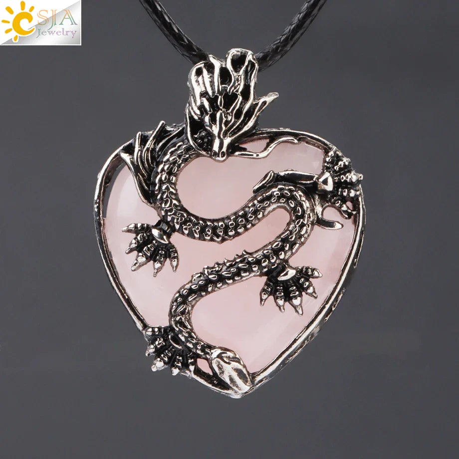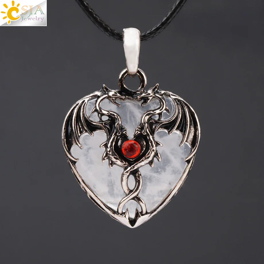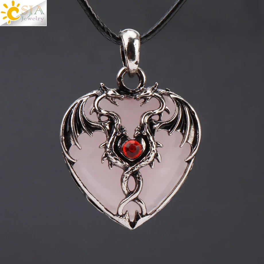 High-quality natural stone heart crystal pendant framed by detailed alloy double dragons, hanging on a durable chain.