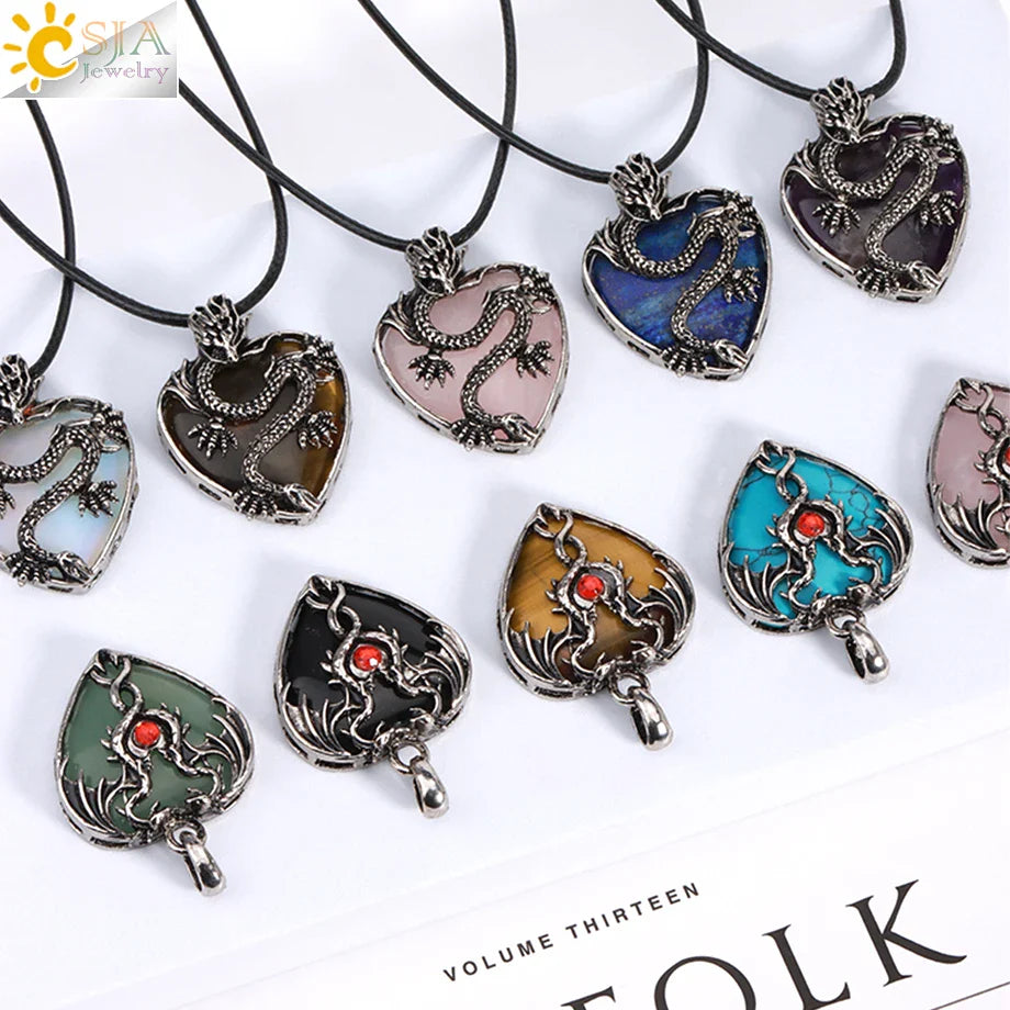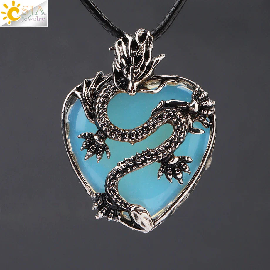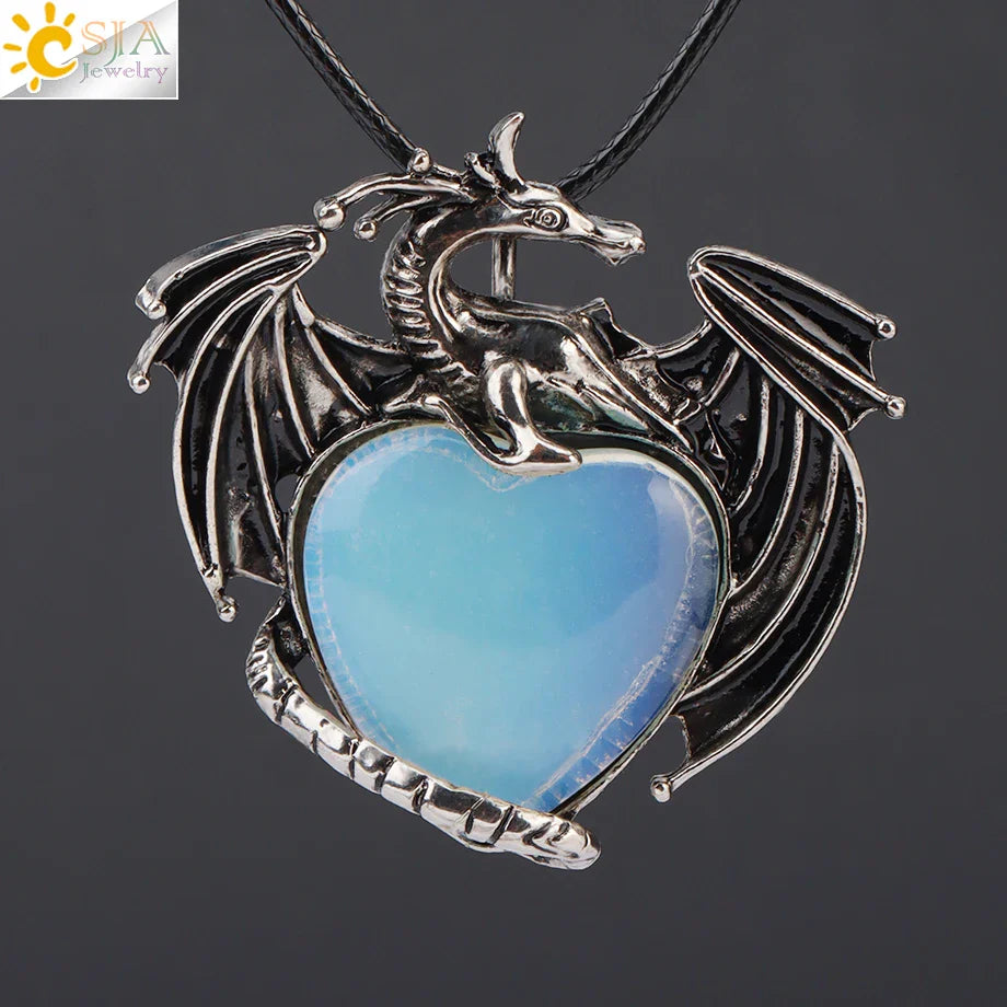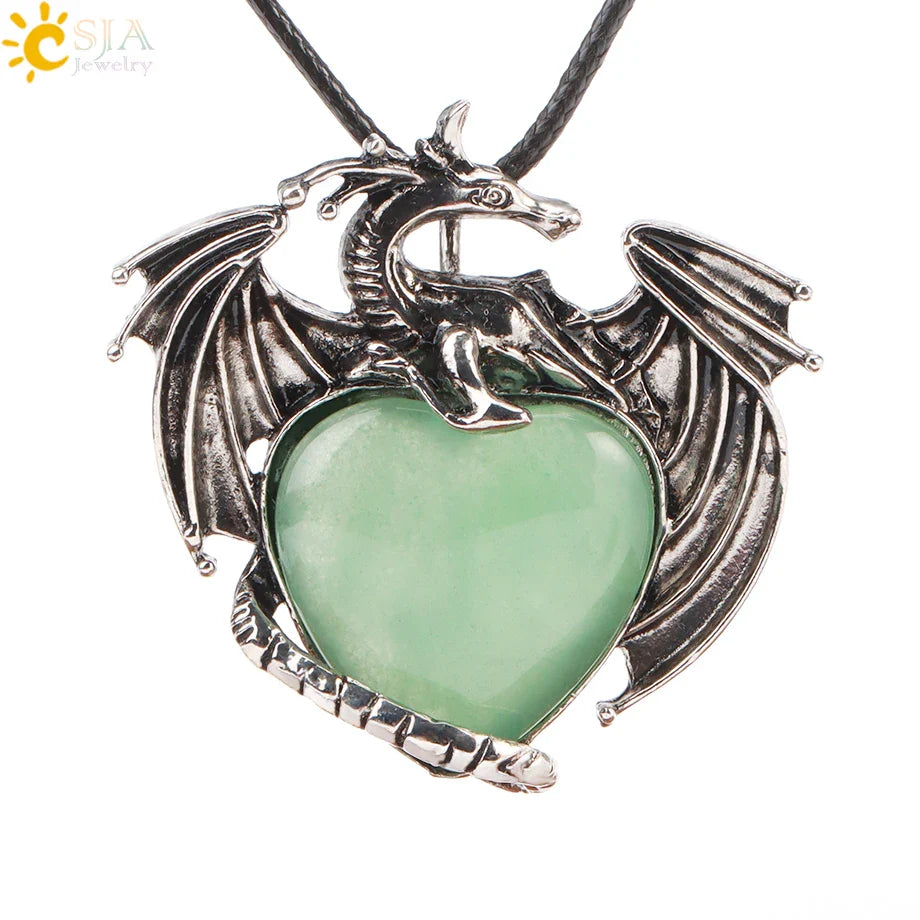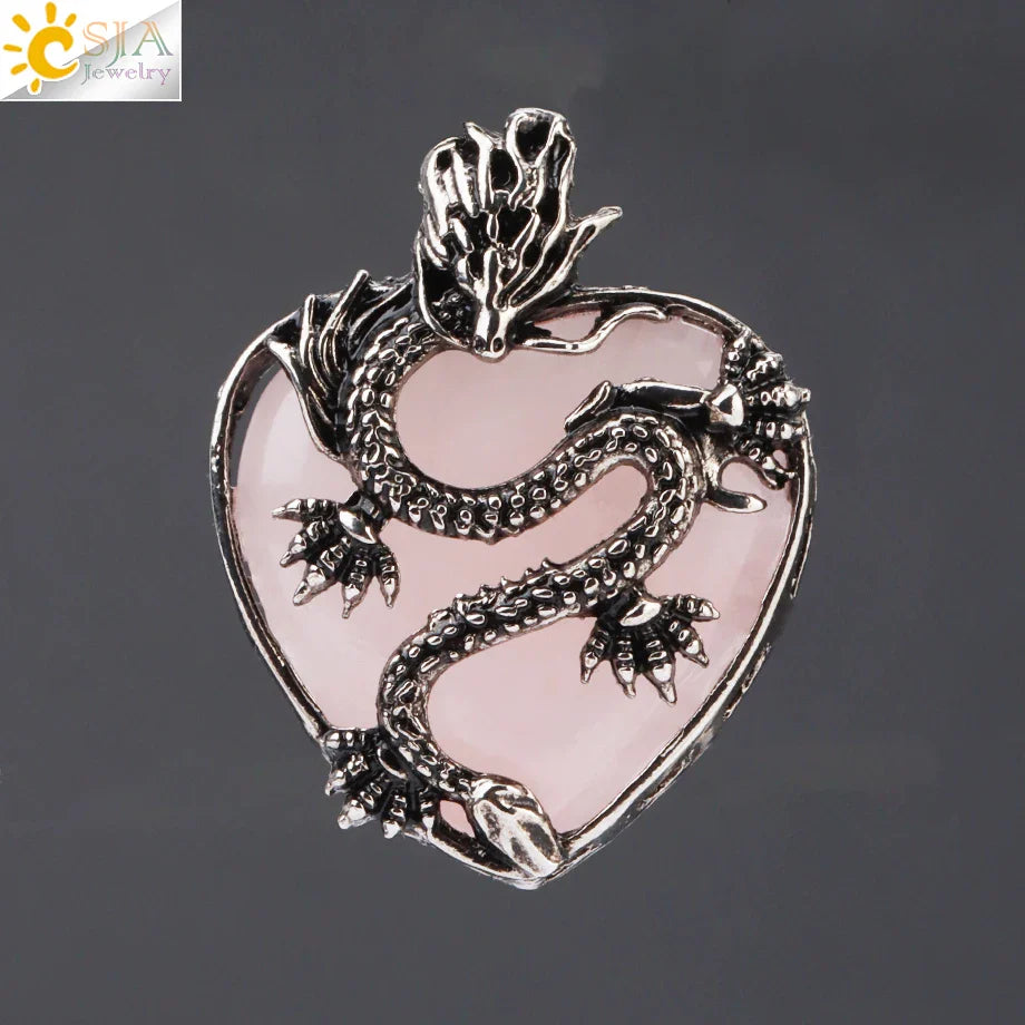 High-quality natural stone heart crystal pendant framed by detailed alloy double dragons, hanging on a durable chain.