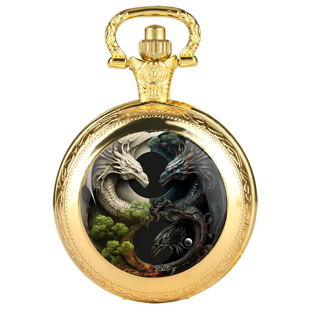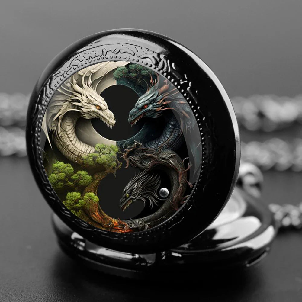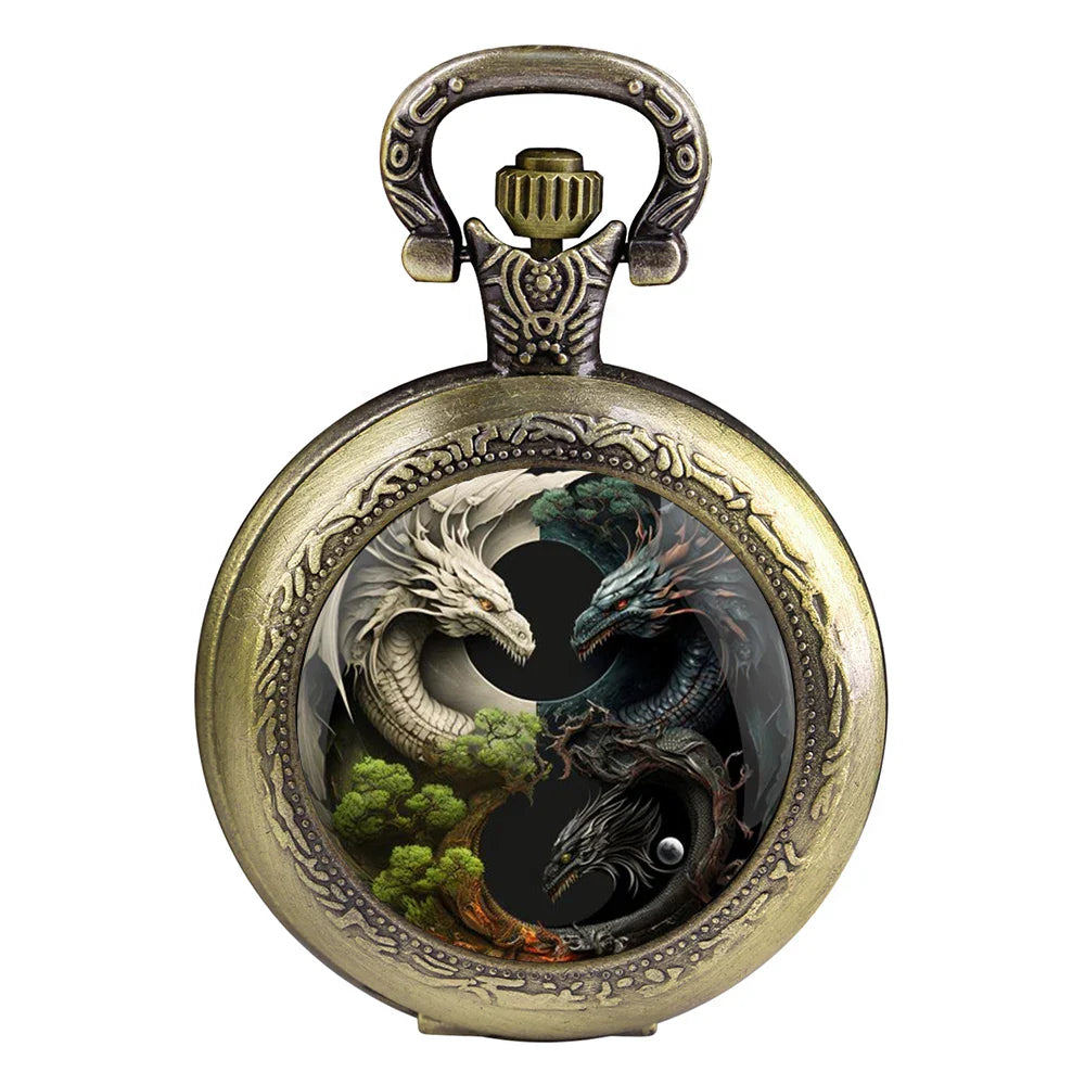 Discover timeless elegance with this vintage quartz pocket watch featuring a mysterious dragon design under a glass dome — a unique pendant necklace perfect for men and women who love classic style with a fantasy twist.