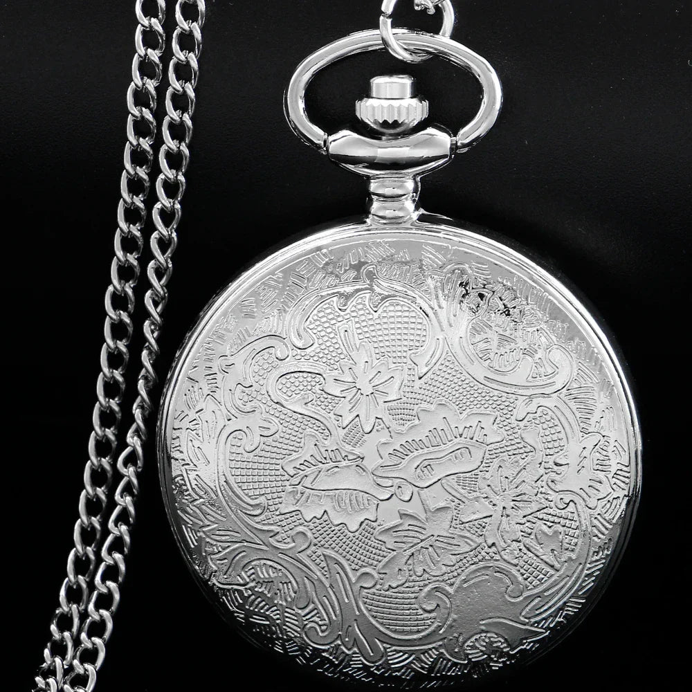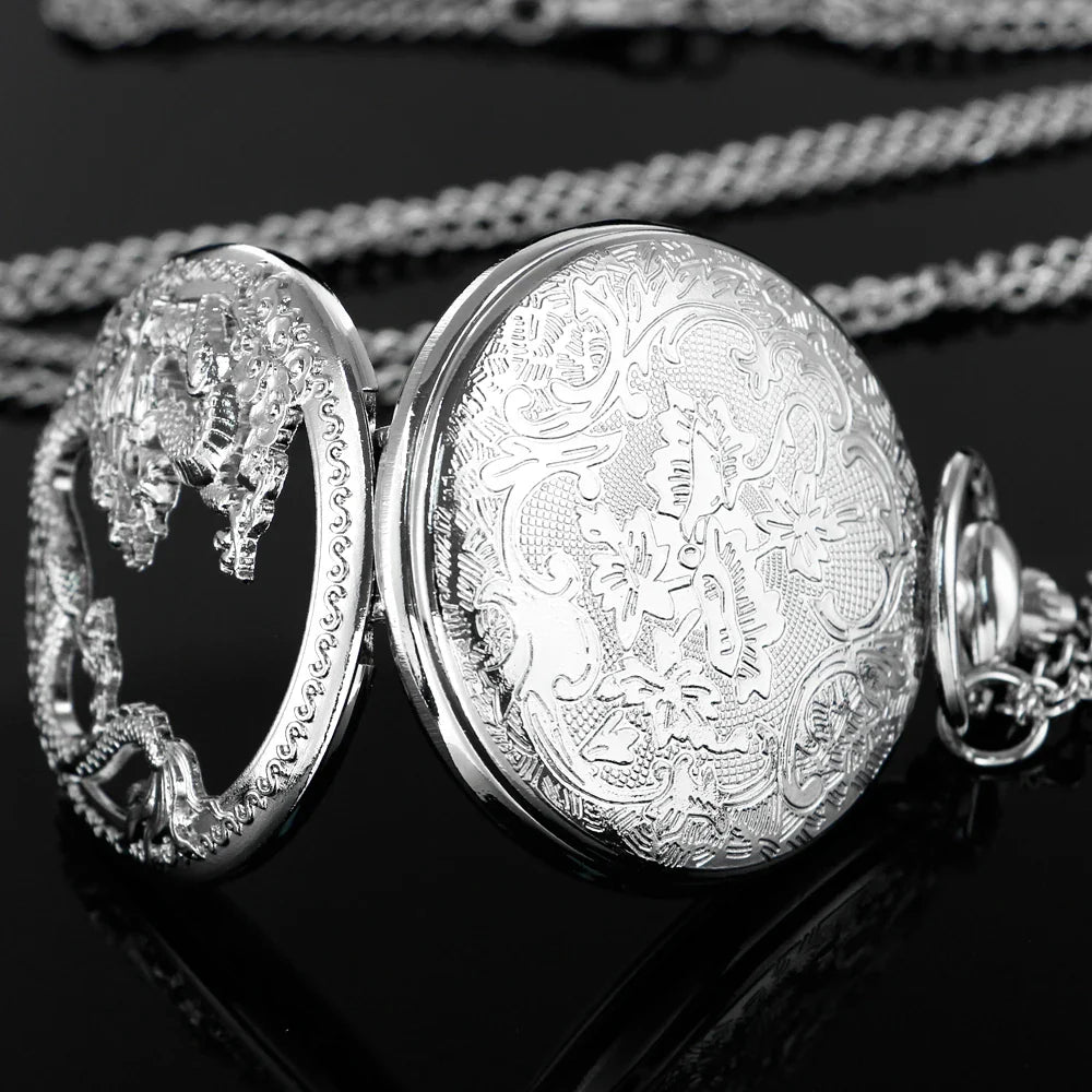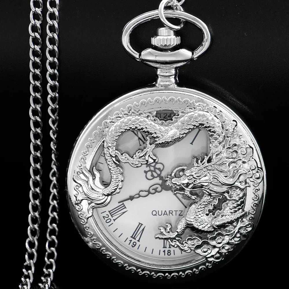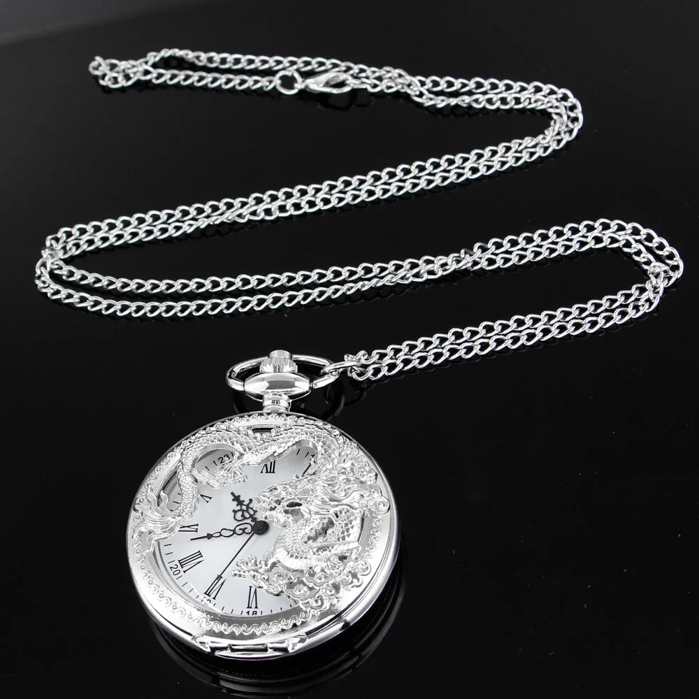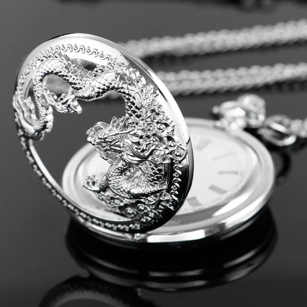 Silver Flying Dragon Quartz Pocket Watch – Vintage Zodiac Pendant Clock Necklace for Men & Women