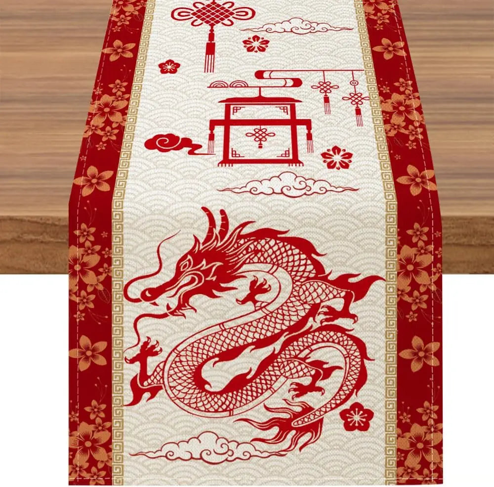 Spring Festival Year of Dragon Linen Table Runner – Happy Chinese New Year 2024 Dining & Party Decoration