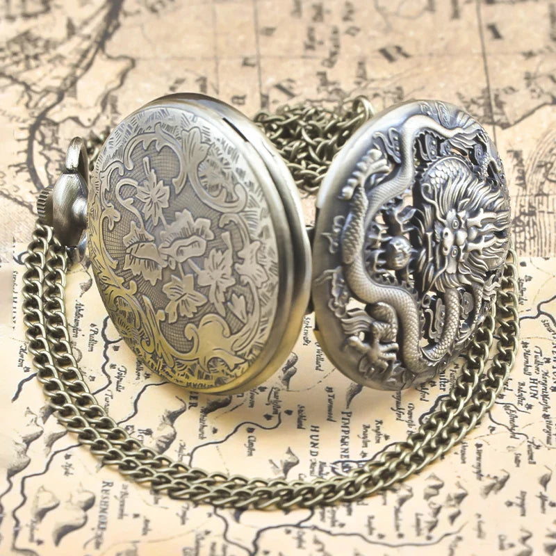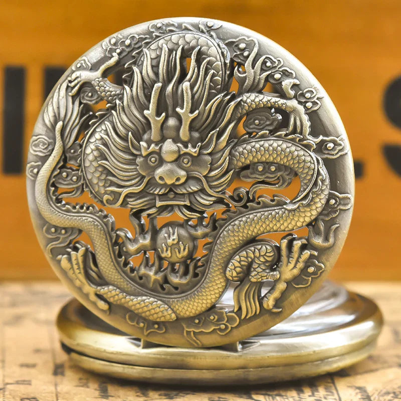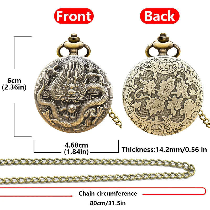 Step into a world of timeless adventure with this Vintage Bronze Steampunk Oriental Dragon Quartz Pocket Watch — exquisitely carved and designed as a necklace pendant, perfect for both men and women who love unique accessories.